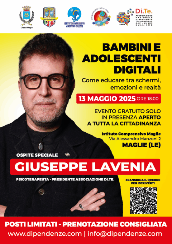 Relatore dell’evento sarà Giuseppe Lavenia, psicologo, psicoterapeuta e presidente dell’Associazione Nazionale Dipendenze Tecnologiche, GAP e Cyberbullismo, tra i massimi esperti in Italia di disagio giovanile e dipendenze digitali.