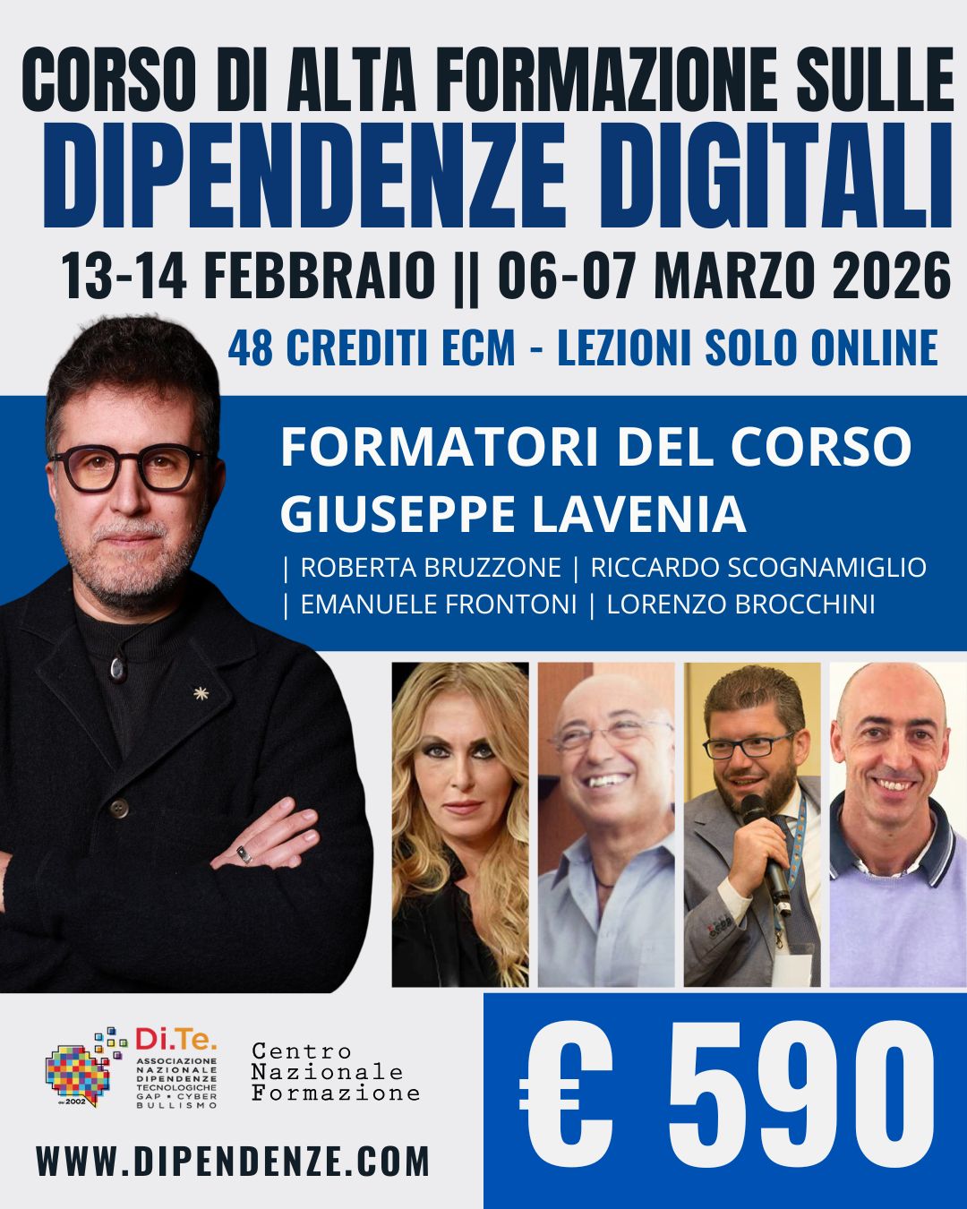 Il corso è a numero chiuso ed è organizzato dal Centro Nazionale Formazione con il patrocinio dell'Associazione Nazionale Dipendenze Tecnologiche, GAP e Cyberbullismo.