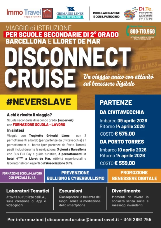 A rendere ancora più significativo il viaggio, sarà la nostra presenza, con gli Esperti dell’Associazione Nazionale Dipendenze Tecnologiche, GAP e Cyberbullismo (ETS), che guideranno i ragazzi in un percorso parallelo di educazione al benessere digitale, attraverso attività pratiche, esperienziali e riflessive.