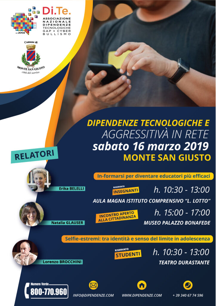 Le Dipendenze Tecnologiche e l’Aggressività in rete. Gli esperti dell’Associazione Di.Te. Lorenzo Brocchini, Erika Belelli e Natalia Glauser ne parleranno sabato 16 marzo nell’Aula Magna dell’Istituto Comprensivo L. Lotto e nelle sale del Teatro Durastante di Monte San Giusto (MC). Dalle 15:00 alle 17:00, Erika Belelli e Natalia Glauser incontreranno la cittadinanza presso il Museo Palazzo Bonafede per parlare di dipendenze tecnologiche. Obiettivo: far crescere la consapevolezza su questi argomenti.